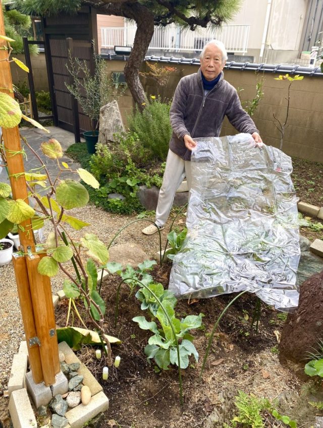 開け閉め可能なシステムにしなくては。あれこれ試しながら、ビニールシートをカットし、棒を埋め込み、クリップでとめ。葉っぱがビニールシートに押しつぶされてしまい