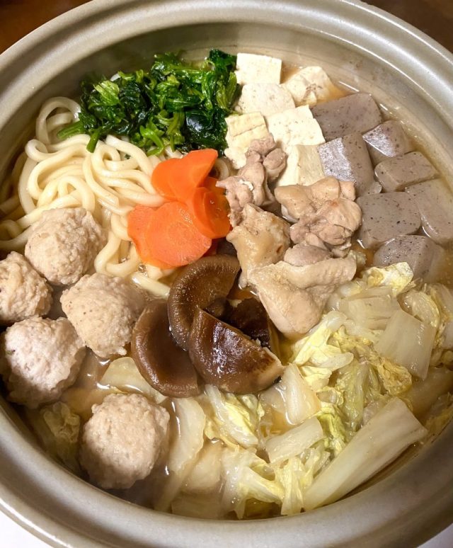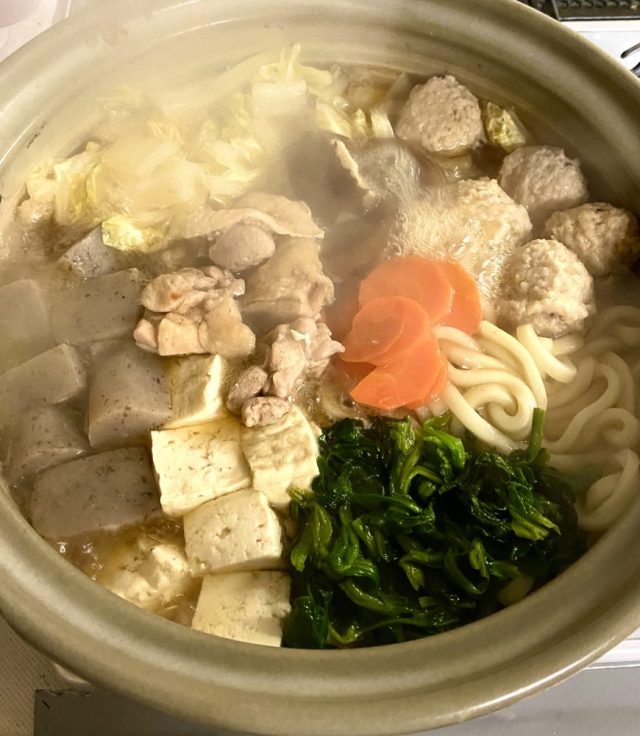 2人だから、囲める鍋。あるもの何でも入れちゃえ〜。「そろそろ食料品を買いに行かなくちゃ」と呟くと、父の目がきらりと光る。