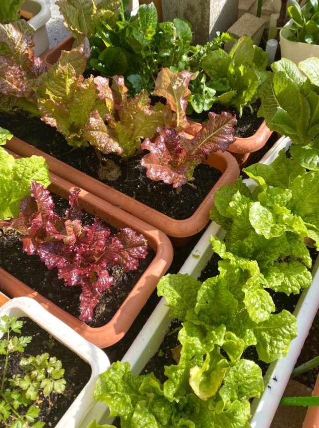 ぼーっと庭で、水やり&日光浴。リーフ類は順調に成長している。レタスやハーブを買わなくなって3ヶ月。この、食事前にささっと