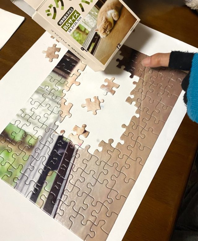 いつのまにか「最初は角、次に端、それから中」と、戦術を持ってパズルにのぞんでいる。残りのピースも、色や模様でグループ分けされている。毎日やり続ければ進化するのだ〜。