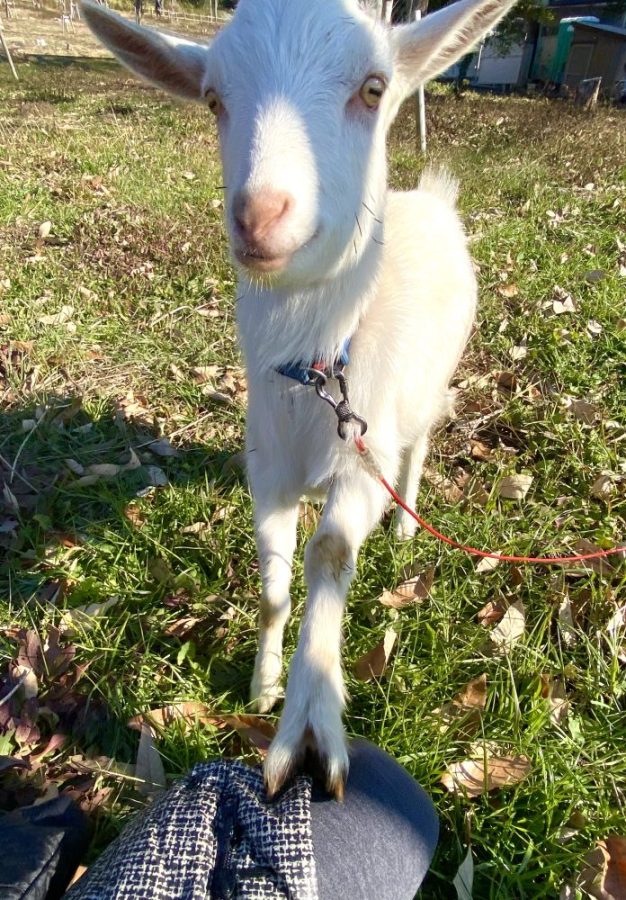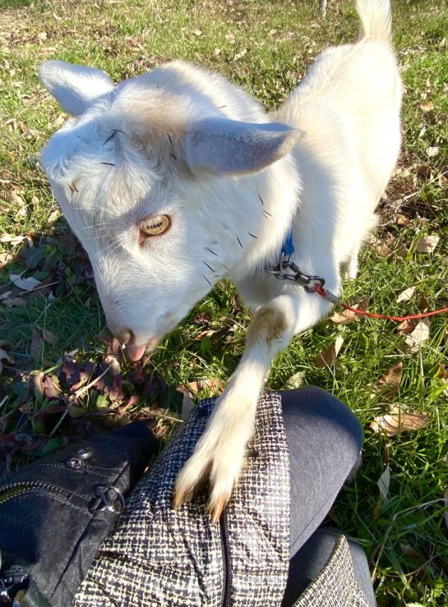 といきなり、そのひづめのある足を私のももの上に乗せてきた。確かに、ヤギは「登る」のが好きだ。だからって、私の上に乗らんでも〜。さらに