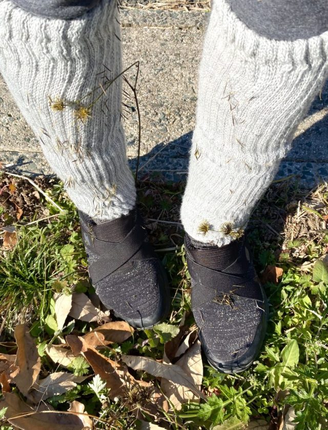 レッグウォーマー、パンツ、靴にびっしりくっついた植物。しばし父と2人、日光浴しながらトゲトゲを取る。これが、払ったくらいじゃ取れないシロモノ。ものすごい力で繊維の中に食い込んでいる。