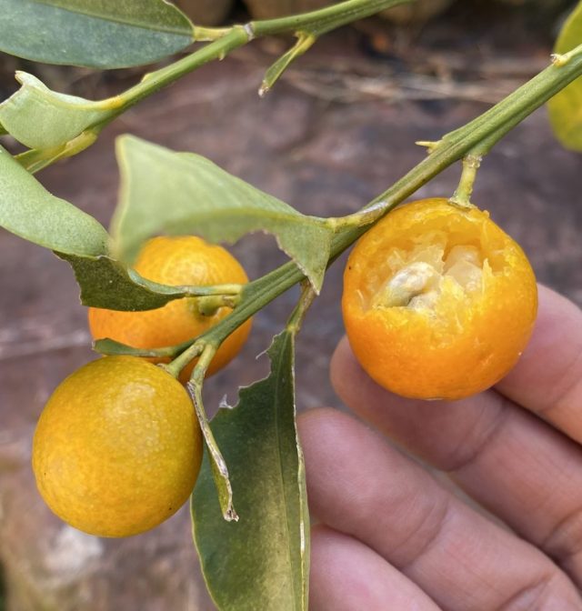 あんまり一生懸命に食べているので、そっとしておいた。写真を撮ろうとスマホを向けたら、その気配を感じ取ったのか、ささっと飛んで行ってしまった。ごめんよー。庭へ出てキンカンを確認すると