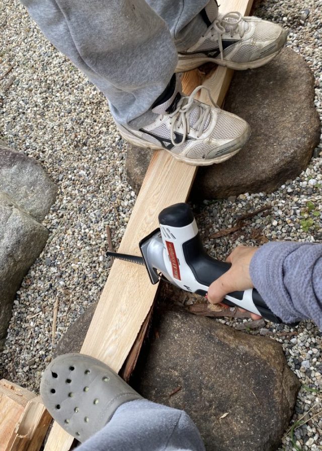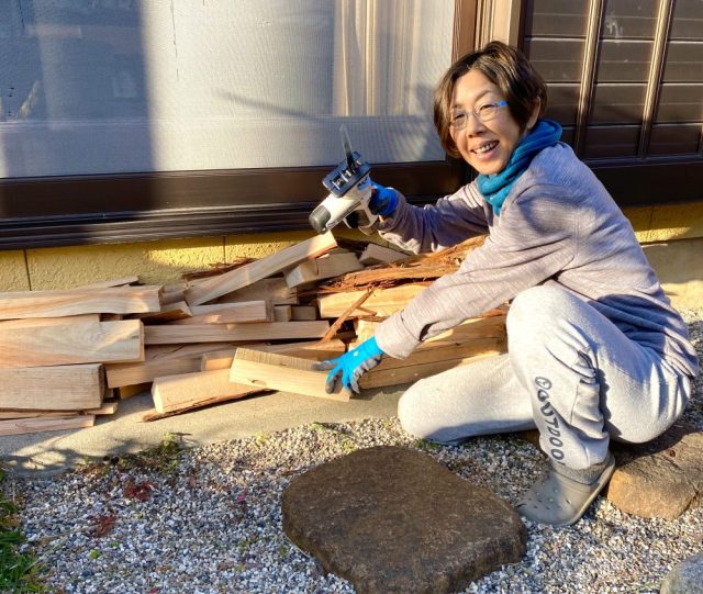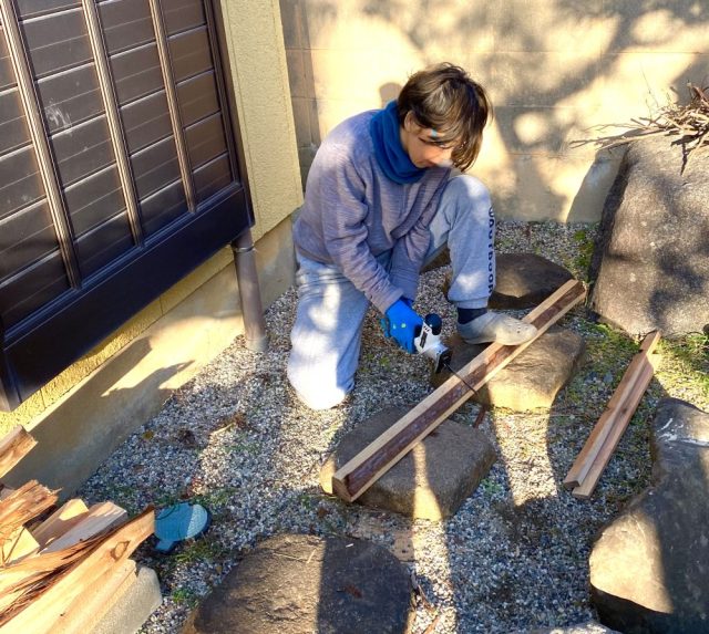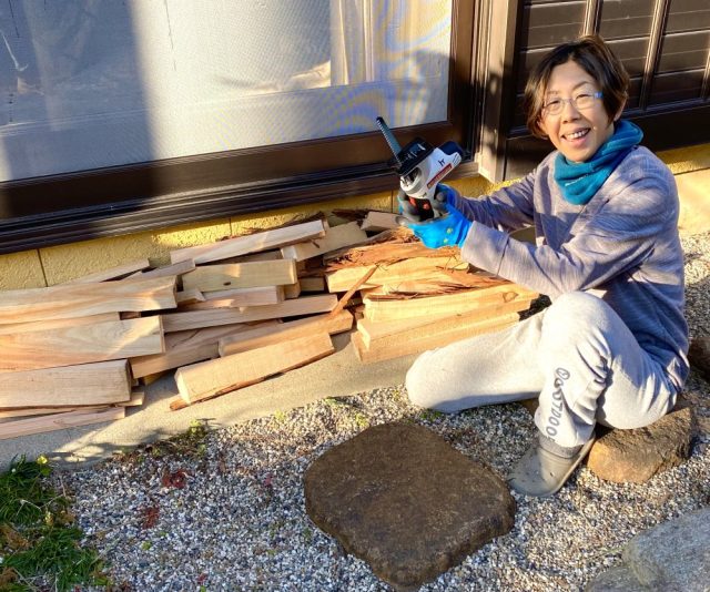 工務店のYさんからいただいた端材を小さくするため、板へ片足を乗せ、思い切り体重をかける。その瞬間、板をつかんだ手にも力を入れ、合わせ技で板をへし折る。だいたい