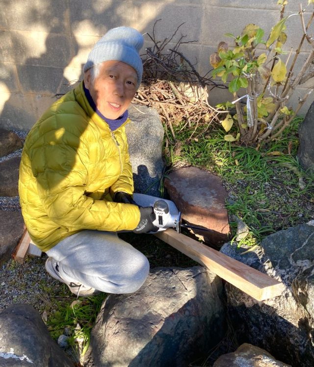 よくよく見たら、父の自慢の「日本庭園の飛び石」を、作業台にしていた(笑)。材木を置くのにちょうどよくて〜。