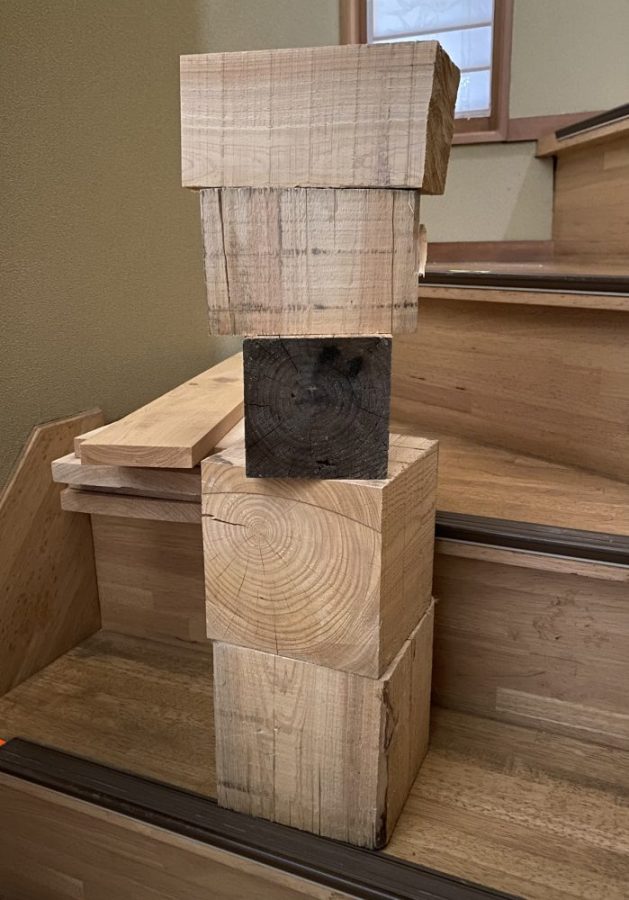 ごろごろと転がる手のひら大の角材。あんまり立派で美しくて、積み木みたいに重ねて置いてみたら、すでにアートだった(写真)。これで何か作れそう〜。