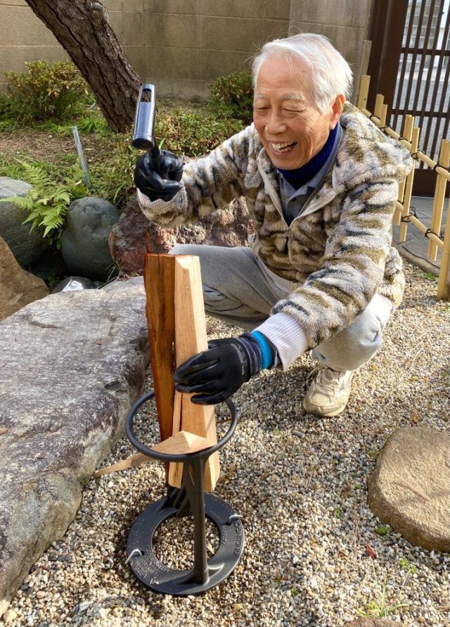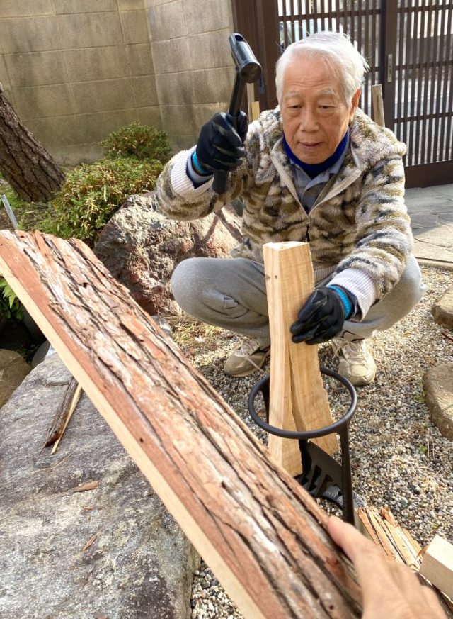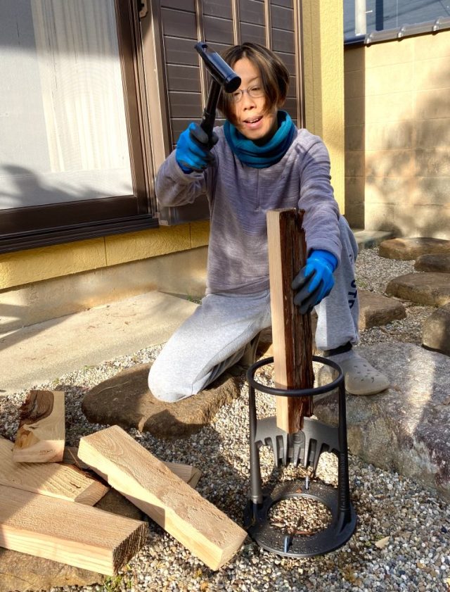 かなり太い角材が、なんと5回できれいに割れた。手応えもかなりいいらしい。「気持ちいいなぁ〜」気をよくした父は、次々と角材を薪割り器に放り込み、ハンマーを振り下ろす。