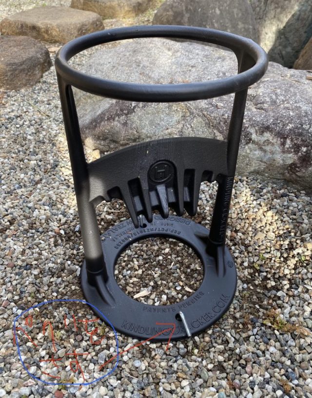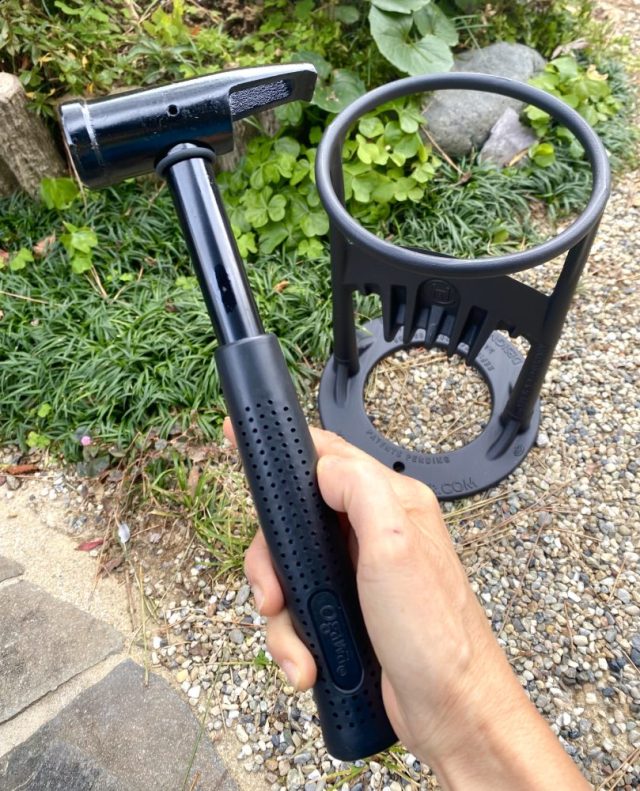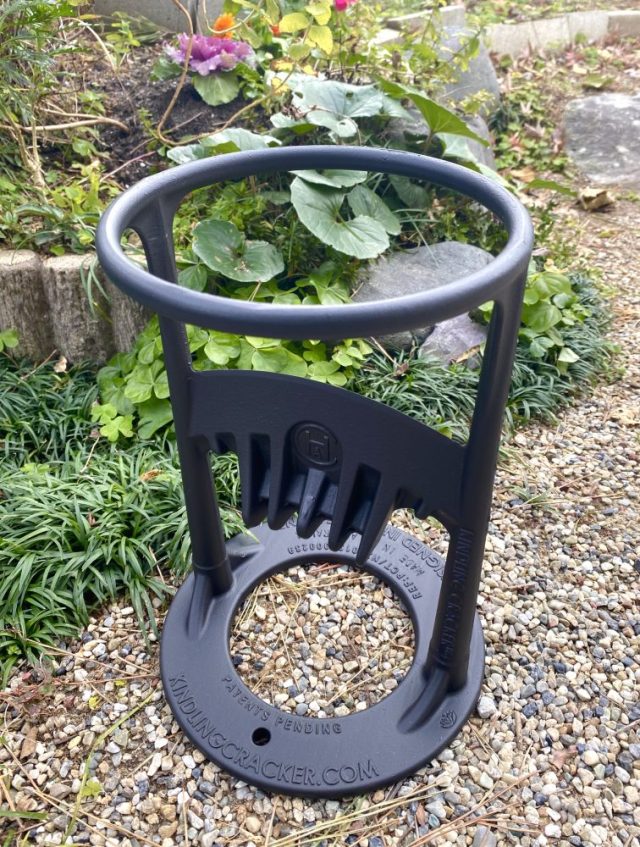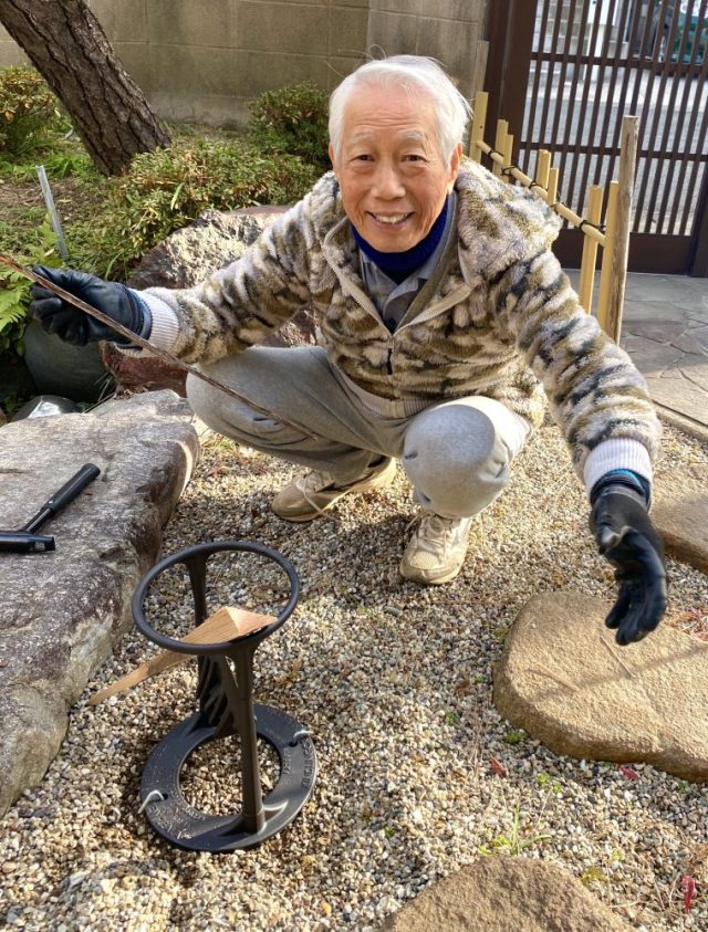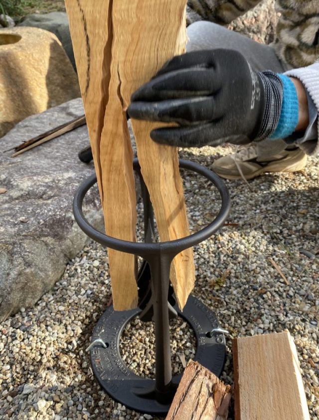 さっそく父が〜(笑)。届いたばかりの薪割り器を庭へ運び、ペグを打ちつけ地面に固定。今や、つくばいコーナーは完全に薪作業場と化した。