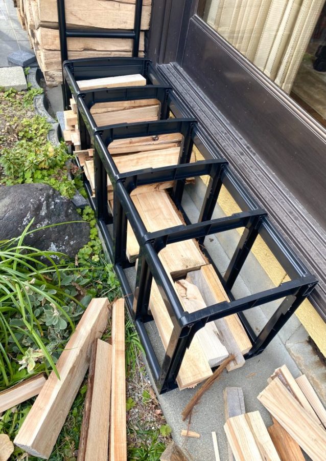 突然ひらめく〜(笑)。さっそく庭に、横にして置いてみたらこれがぴったり。リビングからの視界をさえぎることなく、安定感もあり、何より35〜40センチの薪がちょうど入るサイズ。