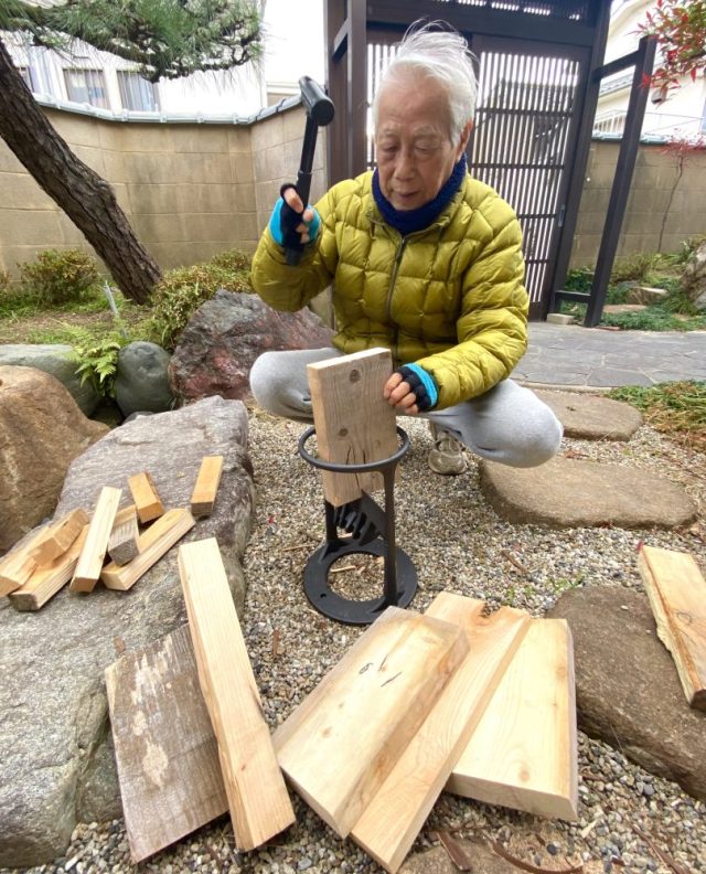 とリズミカルな音がする。見れば父が〜(笑)。なんと自主的に「薪割り器」に向かっているのだった。気が向いた時に15分くらい、ハンマーで木材を叩き割るのが気持ちいいらしい。