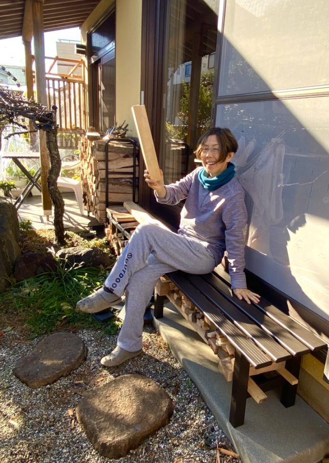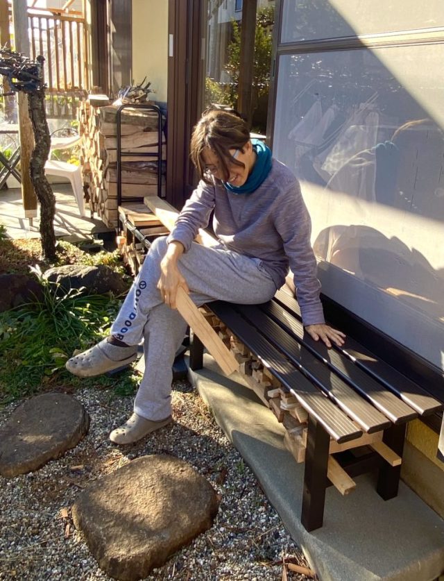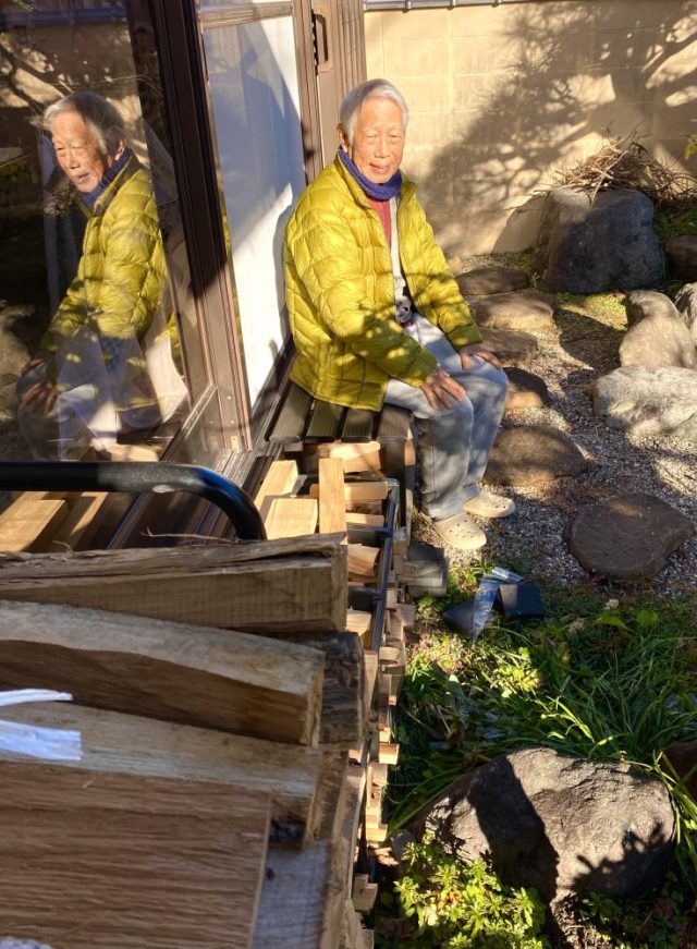 さっそく座る(笑)。庭は使うもの、楽しむもの。そして、出かける場所でもある。父には1年を通して日差しを浴び、外の空気を吸ってほしい。にしても、薪置き場が増えてきた〜。