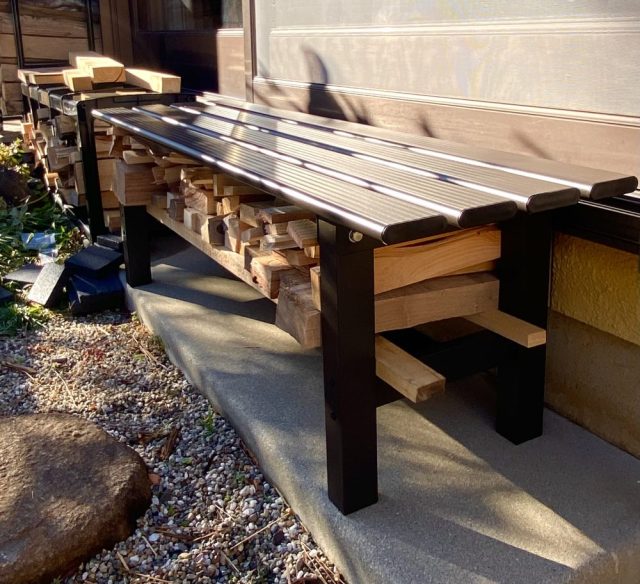 いつも薪のことを考えてる〜(笑)もう愛。さっそくやってみると、あらまぁ。35〜40センチの薪がすっきり収まる。重さでベンチも安定。そんな作業の音に誘われ、父が庭へ。