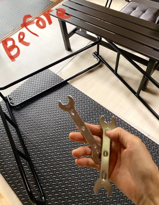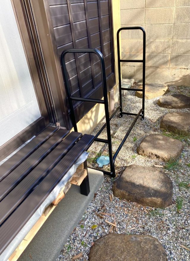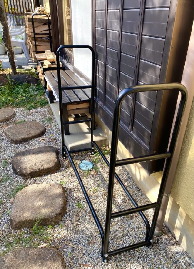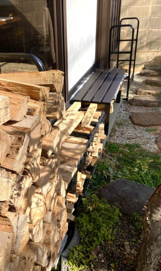 さぶ〜。なんちゅう空気の冷たさよ。すぐに手がかじかんでくる。2台目の薪ラックは、ベンチの横に置くことに。これにて「薪スペース」が完了!