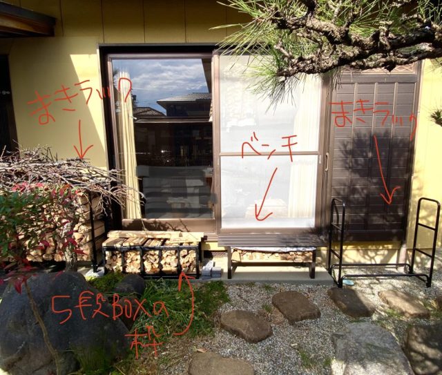 と、4つ仲よく並んでいる(写真)。父の部屋(旧リビング)は南側なので、太陽の光がさんさん。その前のスペースを利用して薪コーナーに。ここなら薪ものんびりできるであろう。