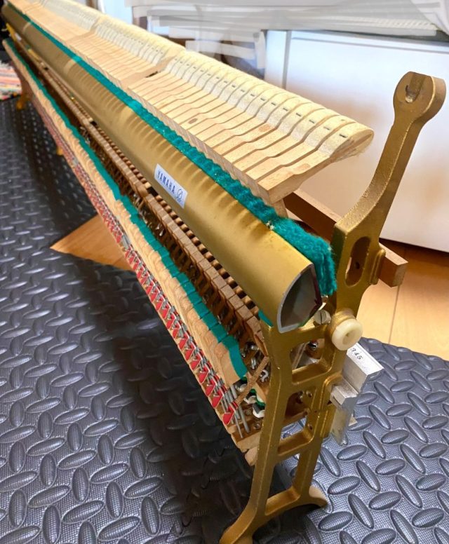ピアノの内部が外され、マットの上に置かれる。これが心臓部。なんだか手術みたい。目で見て、切れている箇所や動きの悪い場所がわかる。中は、想像以上にボロボロ。