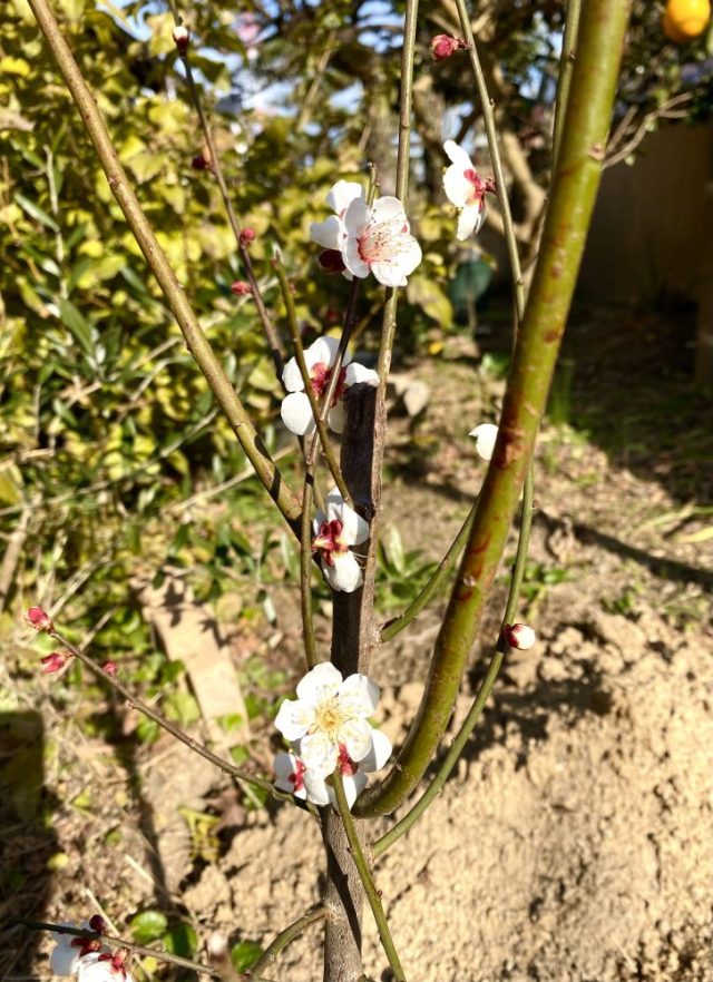 今年、新たにうちの庭へやって来た南高梅。1ヶ月前は「ただの枝」だったのに(笑)今は白い小さな花をいくつも咲かせている。