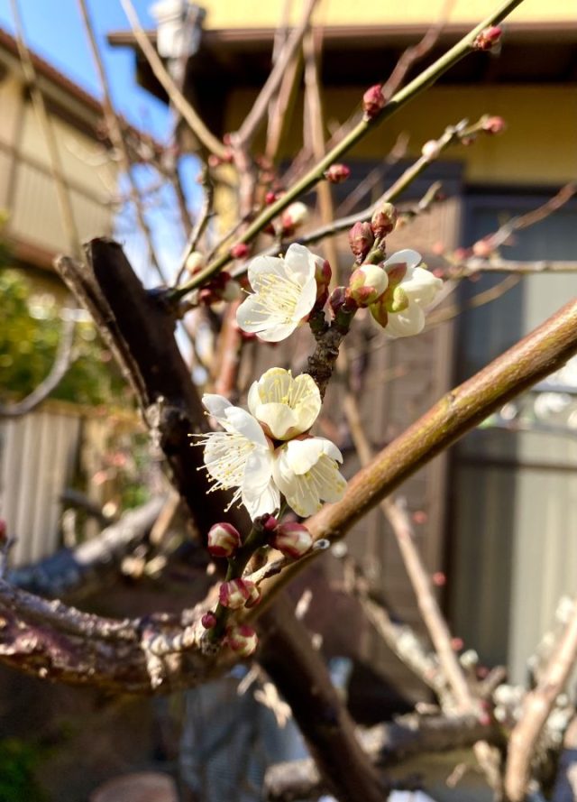 たぶん70%は、センスでいける(笑)。さて。ひと休みに庭へ出ると、梅の花がぽつぽつと。おぉお。寒さの中にも春の気配が〜。日もずいぶん長くなった。