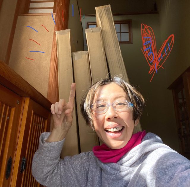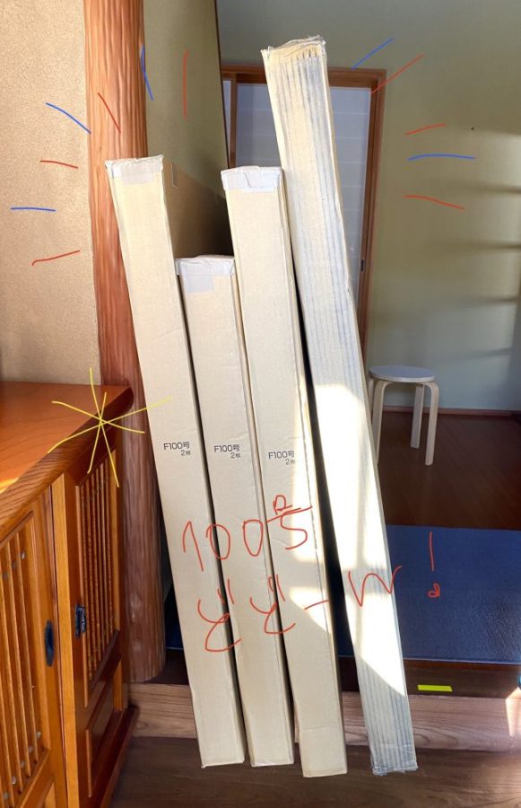 おののく父を横目に、サイズに感動〜。縦横の比率の異なるキャンバスを2枚ずつ、計8枚。配達のお兄さんに代引きでお支払い。1万円札が1、2、3、4、5、6・・・数枚飛んでいった。