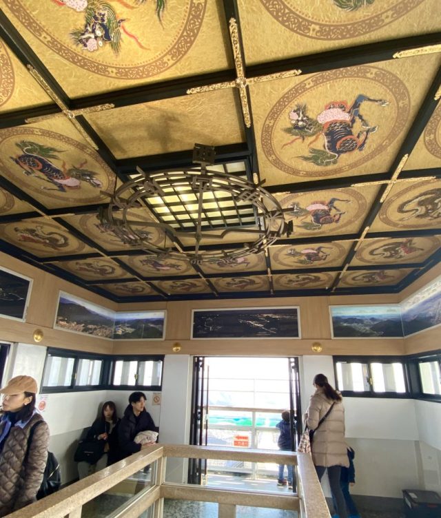 なんという眺め。地平線の果てまでくっきり。天守閣から張り出したテラスをひと回りすれば、360度のパノラマが。これなら、あらゆる角度から「敵の侵入」を確認できる。