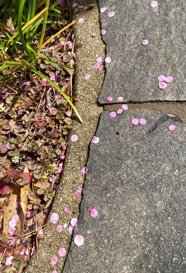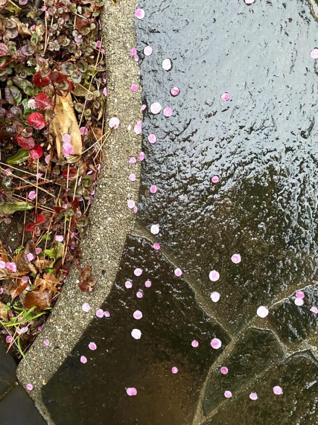 薄紅の花びらが、ぽつぽつと。鮮やかに敷石を彩る。なんて可憐な姿。はかなさと美しさ。その風情に心動かされ、ふらふら歩き回っていると