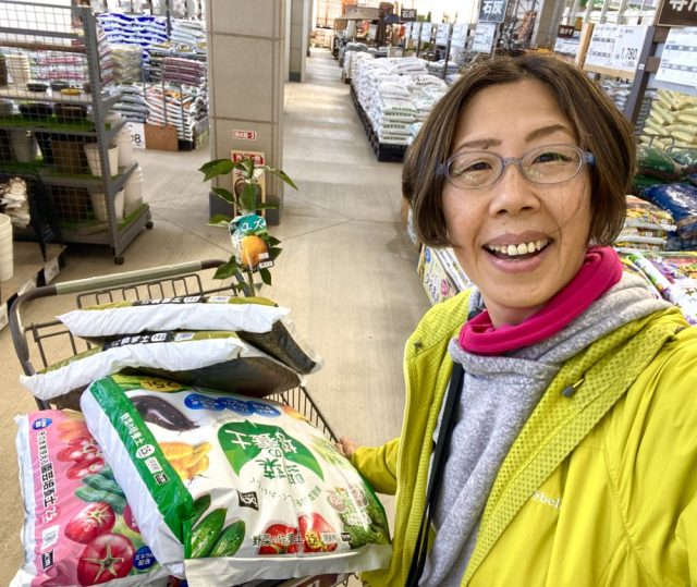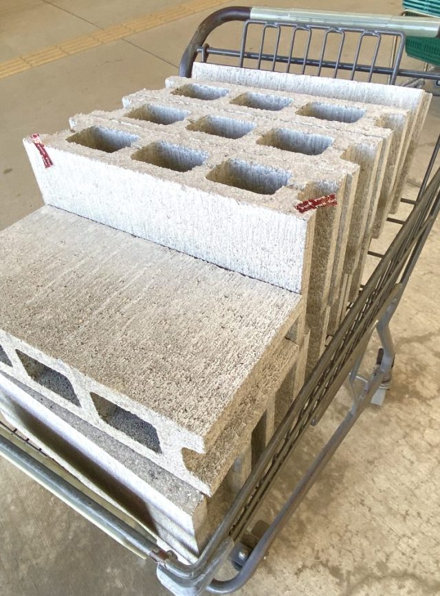 これが重いのなんの〜。父にもカートを押してもらい、よろよろとレジへ。まずは「カートから車へや。ブロックと土を両腕に抱え、ひとつずつ移動。さらに「車から庭へ」。持ち上げて、おろして。