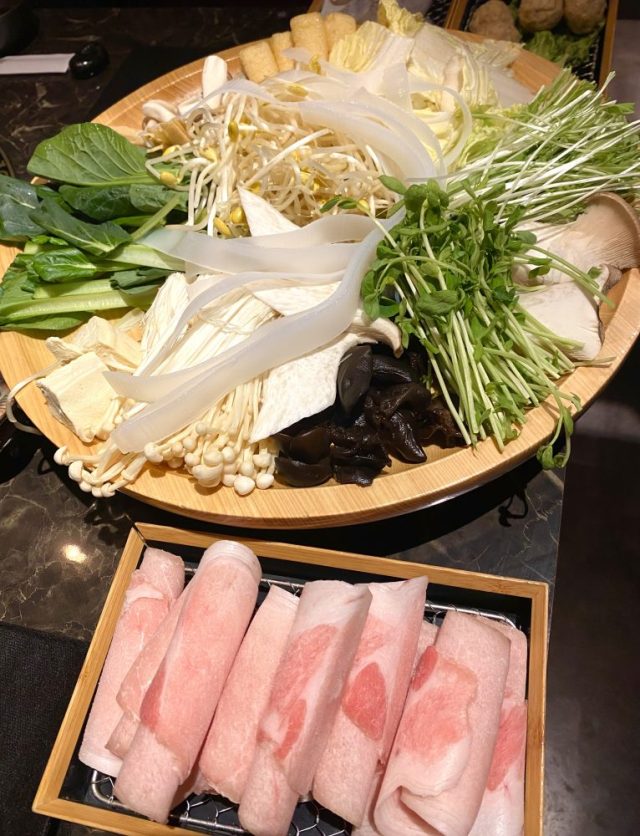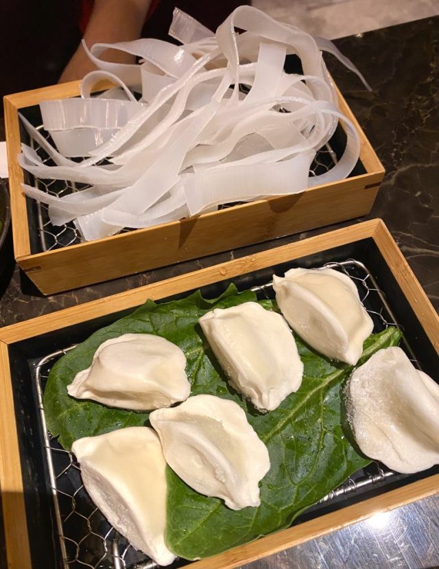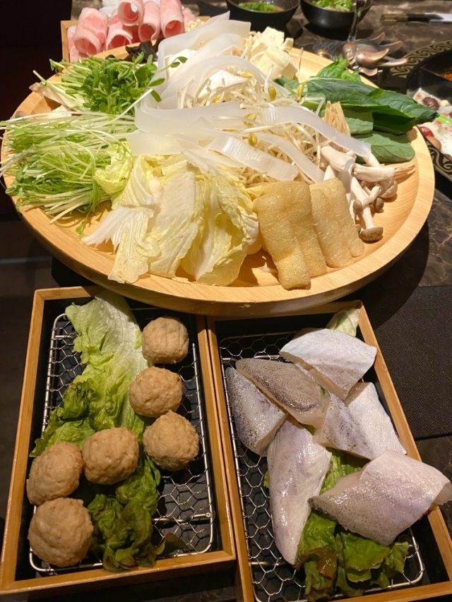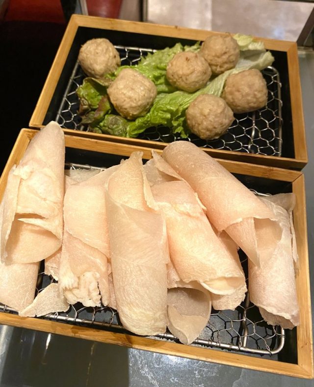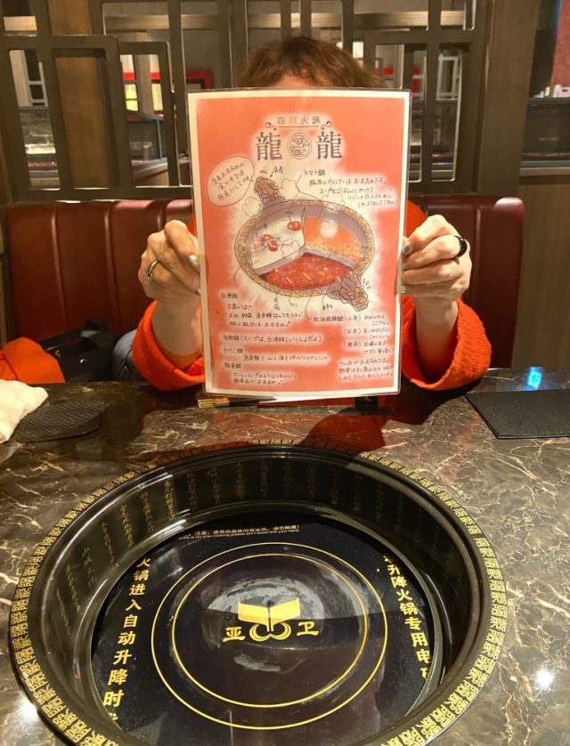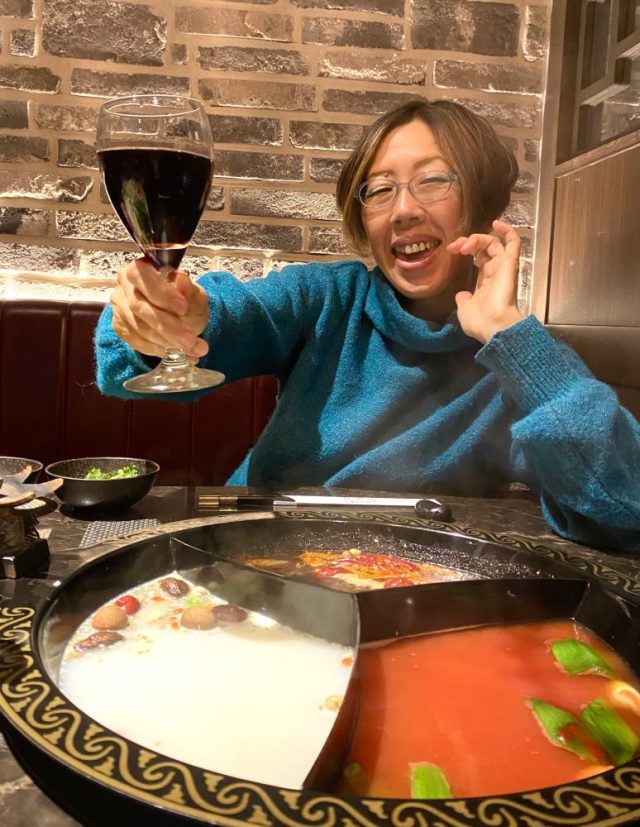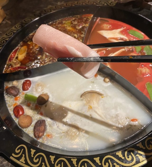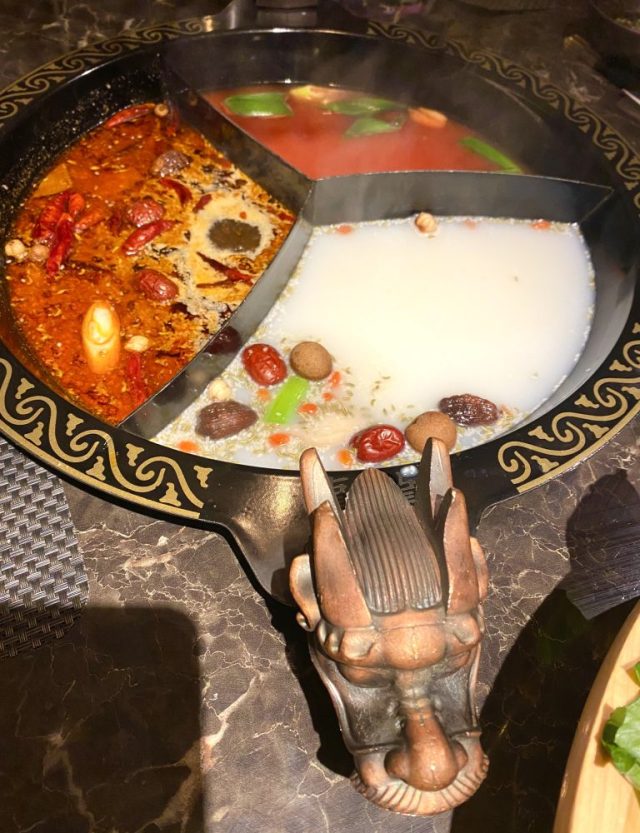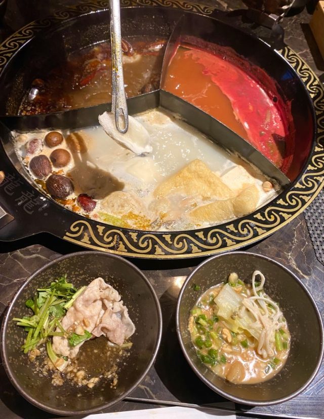 ほおぉ〜、楽しそうやー。テーブルに大鍋が届けられ、ぐつぐつと煮え立ち始める。激赤、白、朱色の3色。それぞれ味付けが違うらしい。肉団子、豚肉スライス、魚、野菜らを