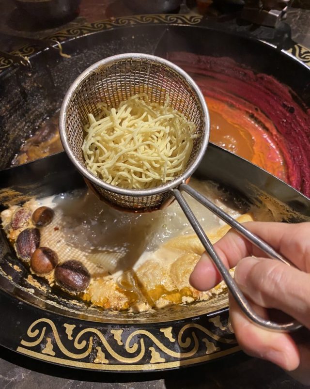 ぽいぽい投げ込んでいると、なんだか鍋というより「温泉」のように見えてくる。唐辛子の浮いた「地獄谷温泉」、漢方の浮いた「白骨温泉」。つかりたくなってくるぜ〜。