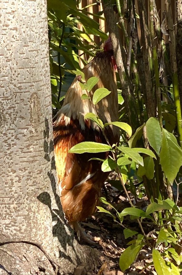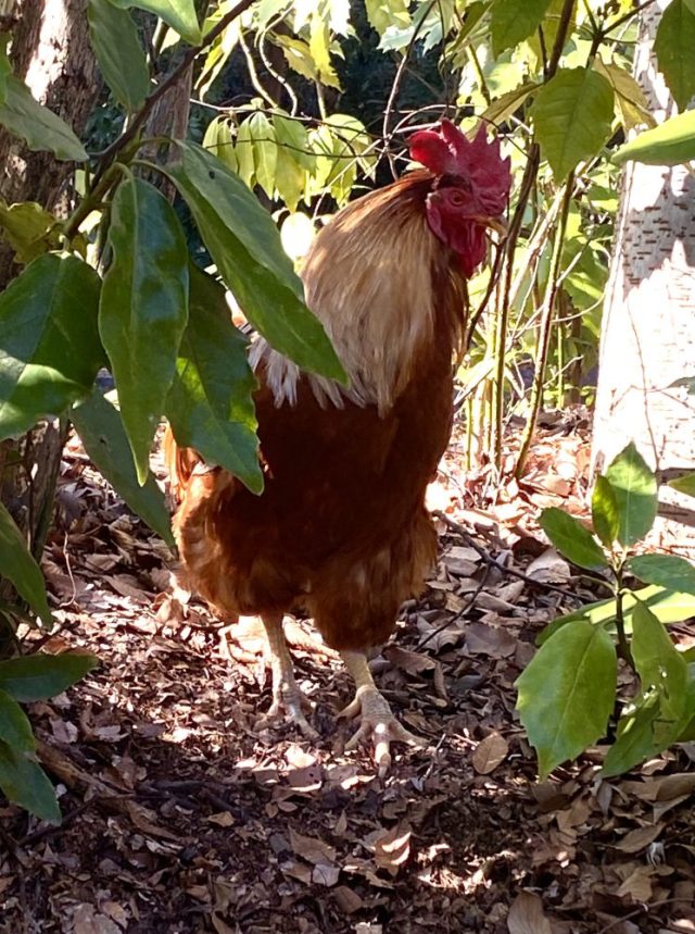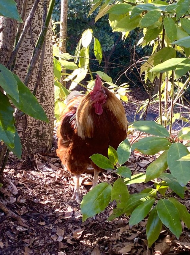 その声に誘われ近づいて行くと、なんと。前方の茂みの中に、あの聖なる鳥「神鶏さま」がいるではないか〜!赤いトサカ、茶色い体、ふさふさつやつやの羽。マッチョで筋肉質でりりしく美しい。