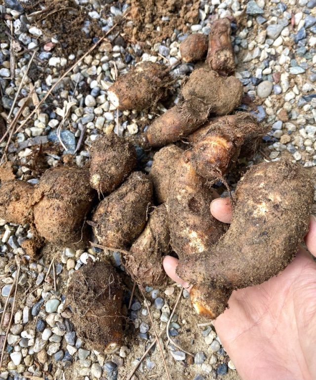 スコップを手にやる気満々。残っていた最後の 1株を、ダメもとで掘り出す。ところが、なんと。これがまぁ、思いがけず豊作(写真)。たぶんうちの庭で