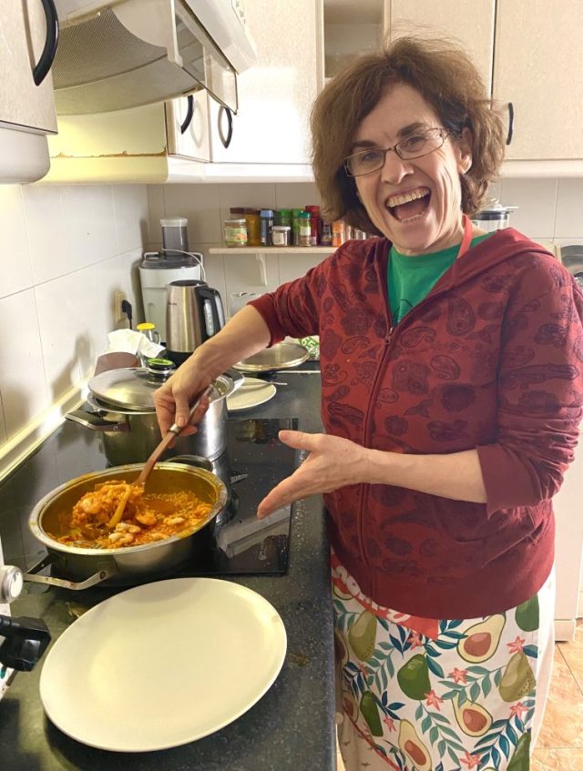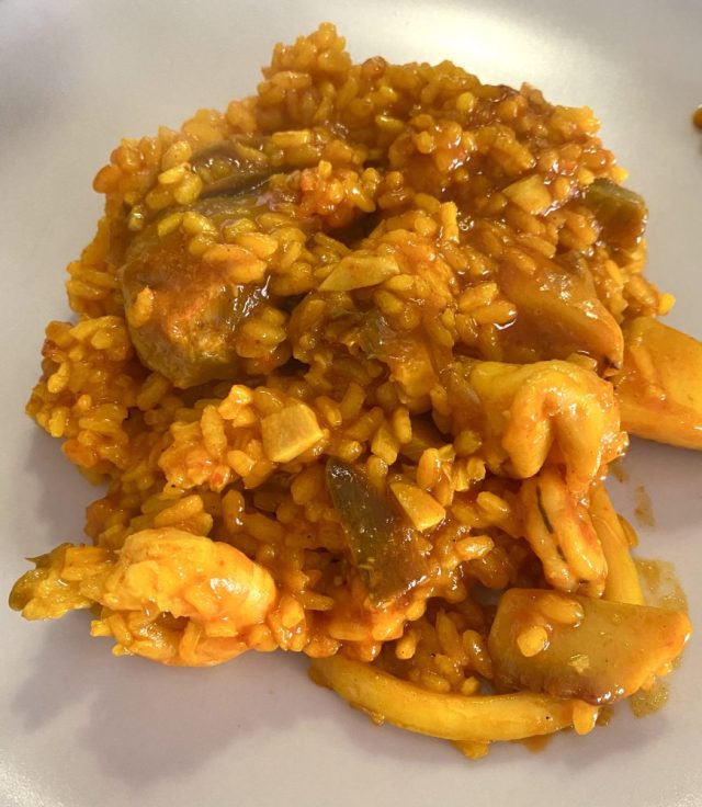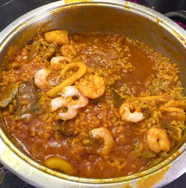 食べるーーーーっ(笑)。なんという幸せ。エビとイカがたっぷり。パエジャより汁気が多くておいしいんだよね。できたての熱々をいただきまーす。