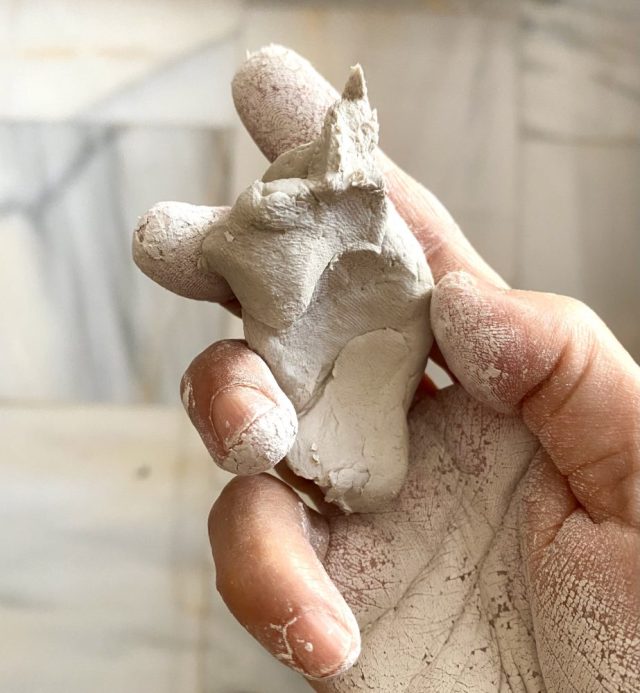 だった。ちょうど生活用品店にいて、目の前に粘土があり即購入。思いっきり「握り潰した」のが始まり(笑)。形を造ることさえできず、その拳をわなわなと上に突き上げた。
