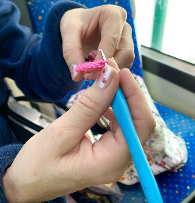 細いピンクの毛糸が、どんどん形になっていく。思わず心を奪われ、じっと見つめていると、私の視線(凝視)に気づいたお姉さんが、ふと顔を上げた。