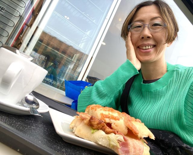 夕食も食べず10時間も寝ていれば。さっそくテラス席で朝食。ベーコン、スペインオムレツ、レタス、トマト入りサンド&紅茶。一気にエネルギーチャージ。朝食後はバスステーションへ。