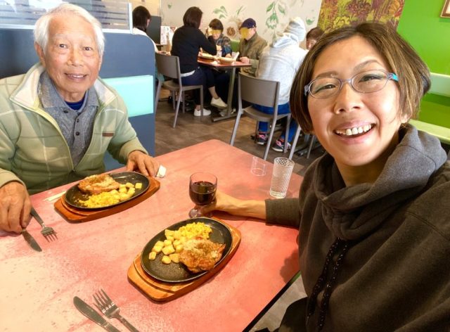 父は水だけど〜。チキン、ドリア、スープ、おいしそうにほおばる父の笑顔が見られてよかった。こんなにのんびりできるのは、もうしばらくなさそう。実は、スペインの手続き問題。