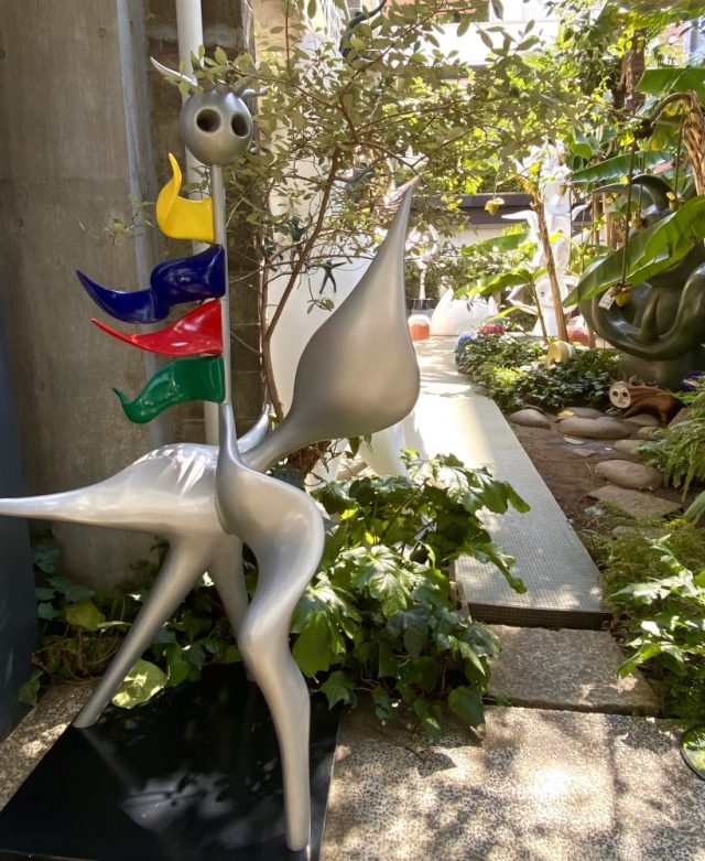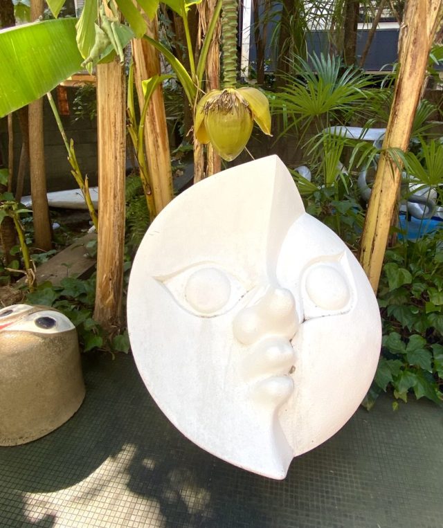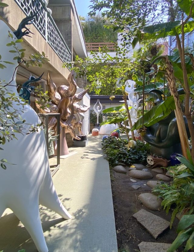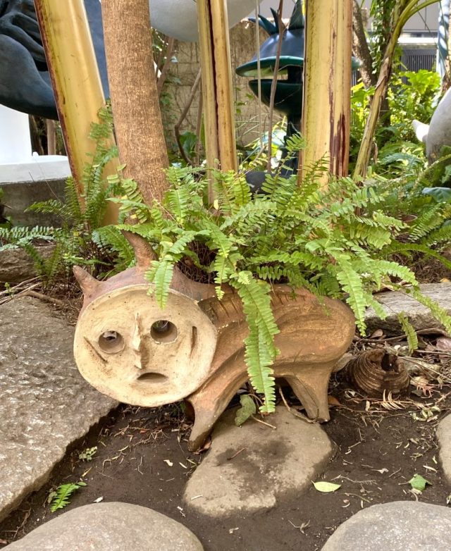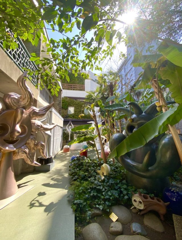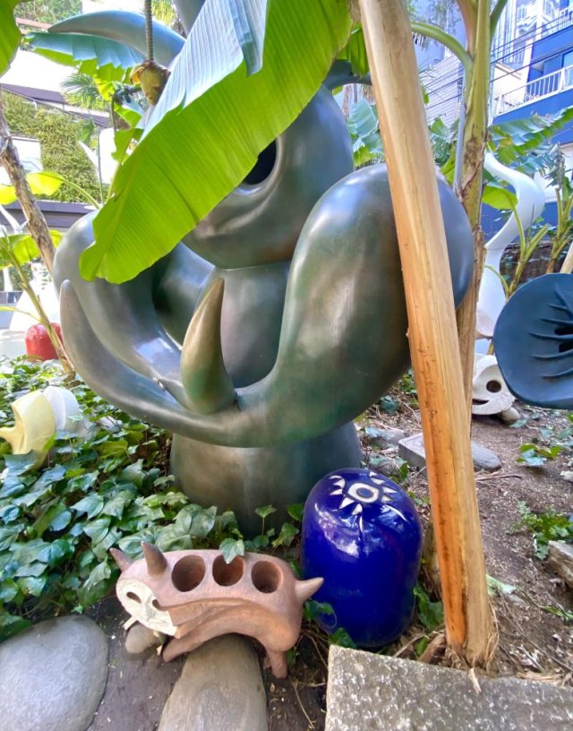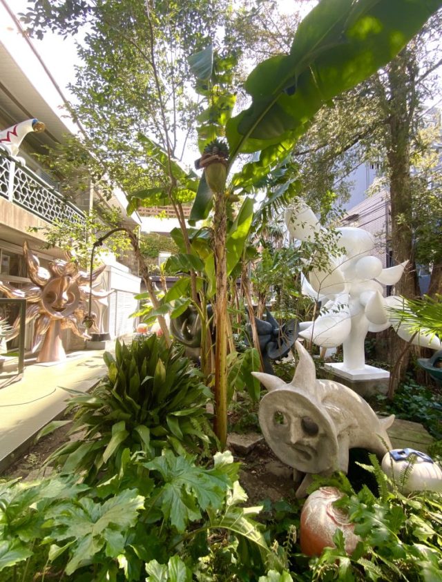 いきなりアートガーデンが。ヤシやバナナの樹が生い茂る南国風の庭。その緑の間から顔を出すタローさんの作品群。まるでかくれんぼ。かわいい〜。作品たちの息づかいが聞こえてきそう。