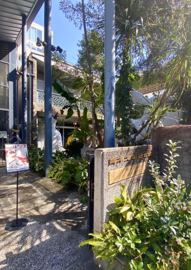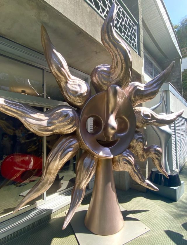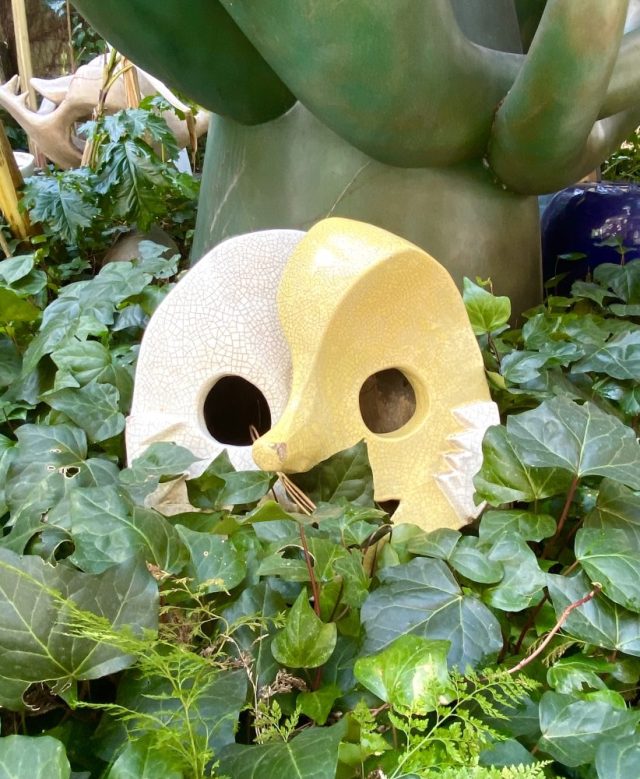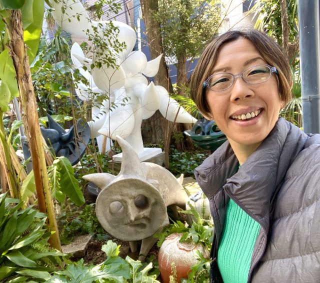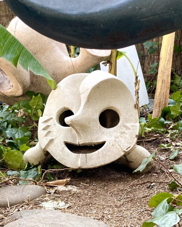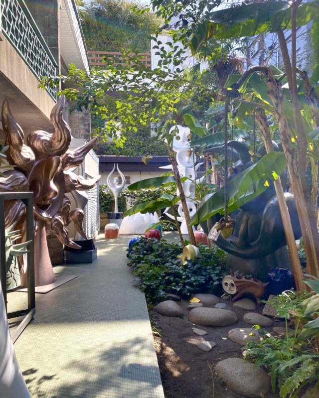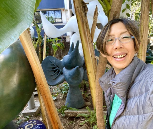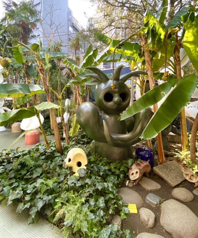 いきなりアートガーデンが。ヤシやバナナの樹が生い茂る南国風の庭。その緑の間から顔を出すタローさんの作品群。まるでかくれんぼ。かわいい〜。作品たちの息づかいが聞こえてきそう。