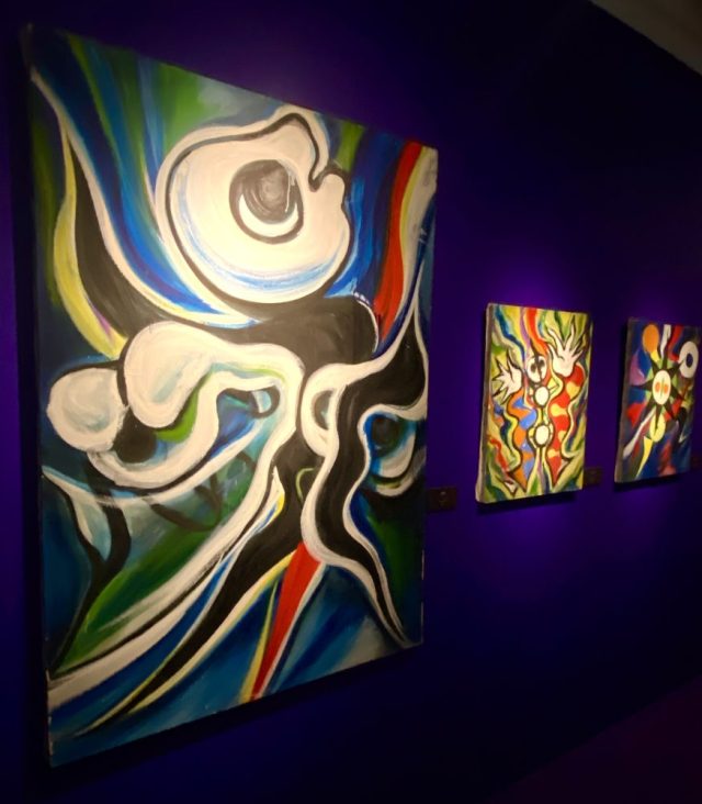 前進あるのみ。挑戦こそが、私の人生。ふつふつと情熱が湧き上がってくる。2階に上がると、作品展示コーナーが。橋を渡って行くような建物の構造そのものがいい。ドアの取っ手部分とか。