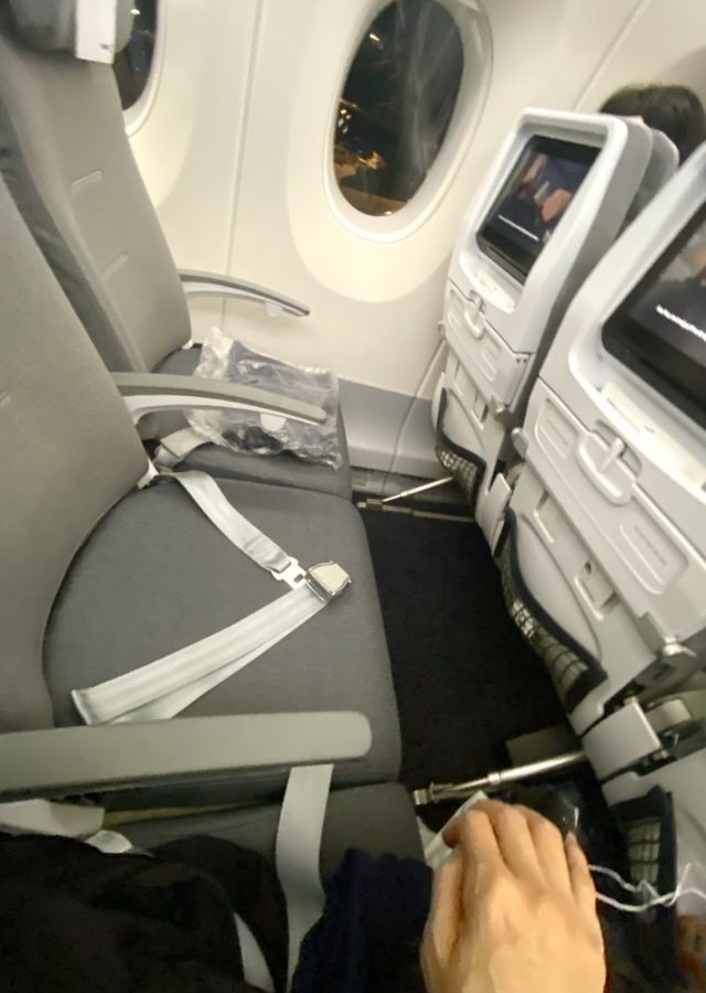と、あきらめモードで飛行機に乗り込む。と、なんと。私の座った3人席。隣は2席とも空いている。
