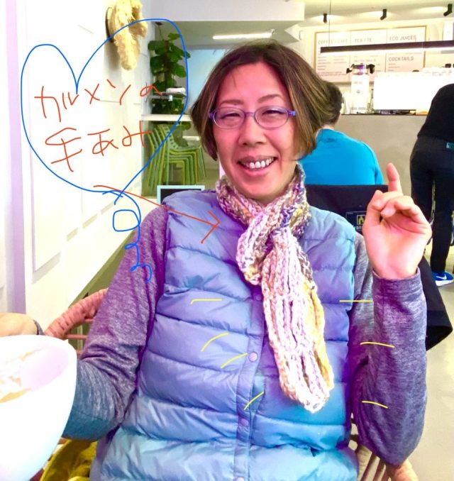なんとカルメンから、手編みマフラーのプレゼントが。ミニサイズなので、かさばらず使えて便利。色もグレー&黄色で何にでも合いそう。