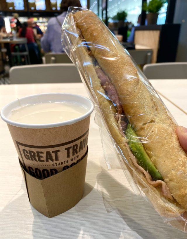 の表示が。ぴったりかい〜。セキュリティチェックを終え、やっとひと息。さっそく朝食を食べにカフェテリアへ。まぁ、ここも大にぎわい。