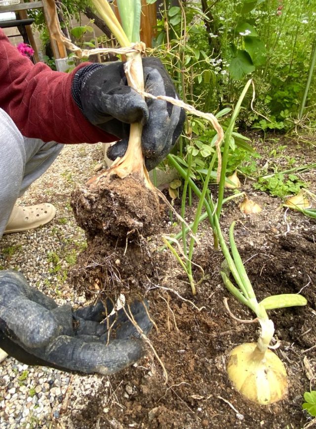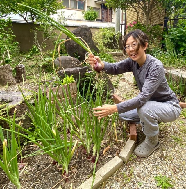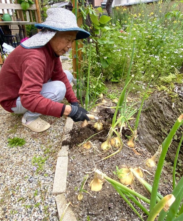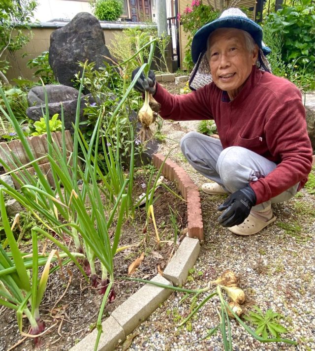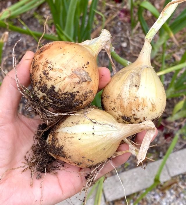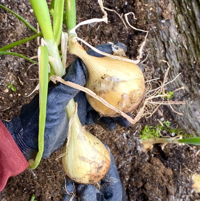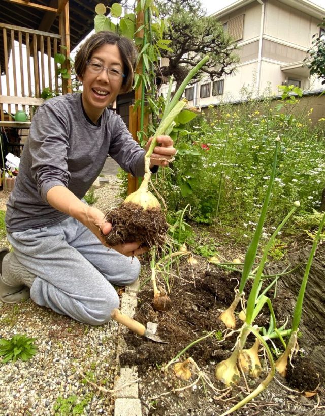 大豊作。実は今回、白玉ねぎと紫玉ねぎの2種類に挑戦。ほぼ同時に植えたのに、白の方が早く収穫を迎えることになった。