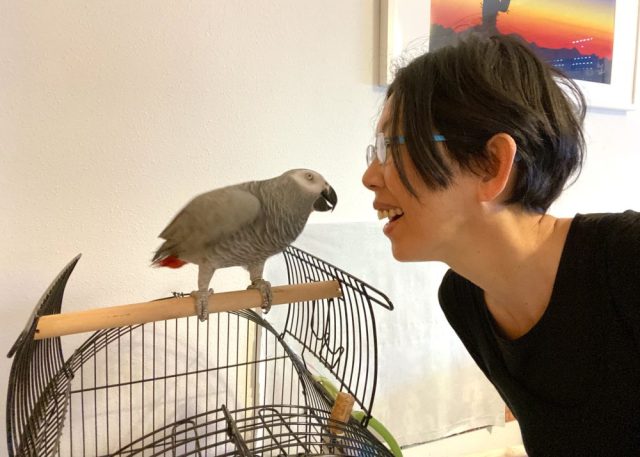 皿に頭を突っ込んで、勢いよく食べるココ。その姿に元気をもらう。環境が変わったせいで、ボロボロになってしまうオウムはたくさんいる。自分で羽を抜いてしまったり。でも、ココは