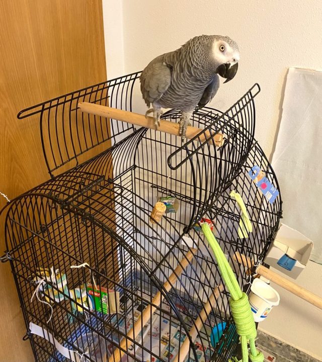 へすぐさま飛んで行った。鳥かごには見向きもせずに。まずは部屋をくまなく探検。我らがテリトリーを自分の足で歩いて確認。羽をぼわっとふくらませ、大満足の様子。