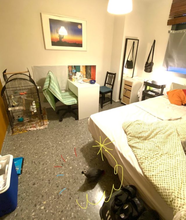 ベッドが部屋の半分を占めるので、小さなデスクとイス、鳥かご、整理キャスターでいっぱいになってしまう。ココは移動用キャリーから出ると、いつものように