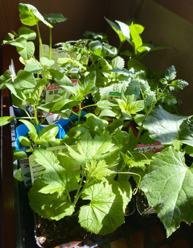 「すくすく育っておくれ〜」「ゴーヤで緑のカーテンを作ろうか」「お母さんがよくゴーヤを作ってたよ」「えーっ、聞いておけばよかった」