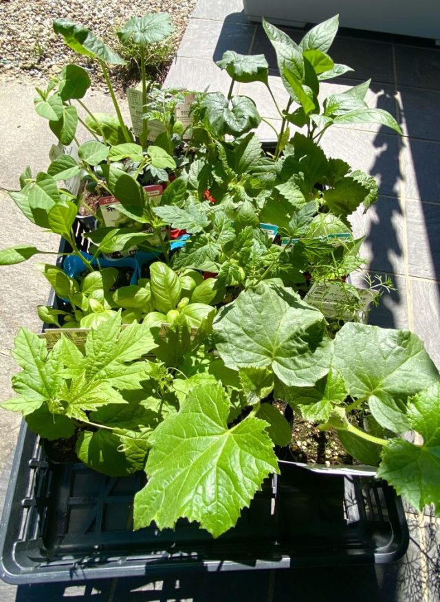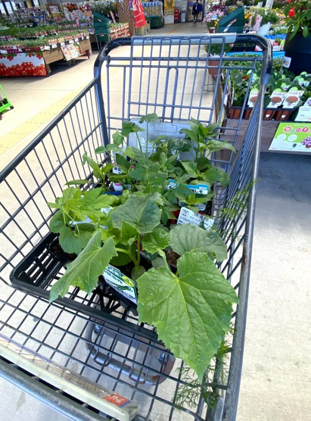 ゴーヤ、枝豆、オクラ、パプリカ、きゅうり、とまと、しそ、バジル、パセリ・・・どんどんカートへ。楽しくていいのだけど、大変なのは