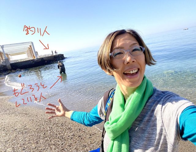 釣り人、犬を散歩させる人、サンドイッチを食べる子供とお母さん、海に潜ろうとしている男性、1人海を眺める女性・・・