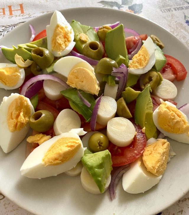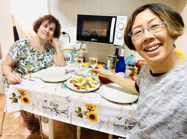 あっという間にランチができあがる〜。冷えた白ワインで乾杯。ここまで1ヶ月、本当にお世話になった。カルメン、楽しい共同生活をムーチャス・グラシアス!