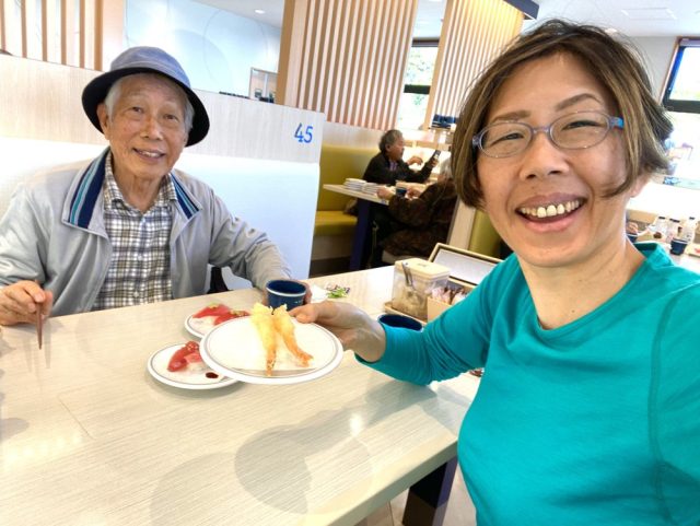 と父に誘われ、回転寿司ランチ。2人で200円引き。鉄火、ブリ、まぐろ、うなぎ、炙り鴨、海老天、カルビ・・・思いっきり食べて