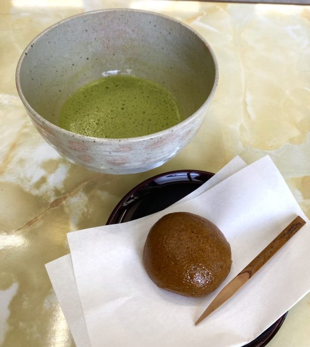 お姉さんに誘われ長イスへ。ゆったり一服。お茶を点ててもらうなんて久しぶり。おいし〜。幸せー。藤の花、いけばな、抹茶にまんじゅうと、日本満喫。
